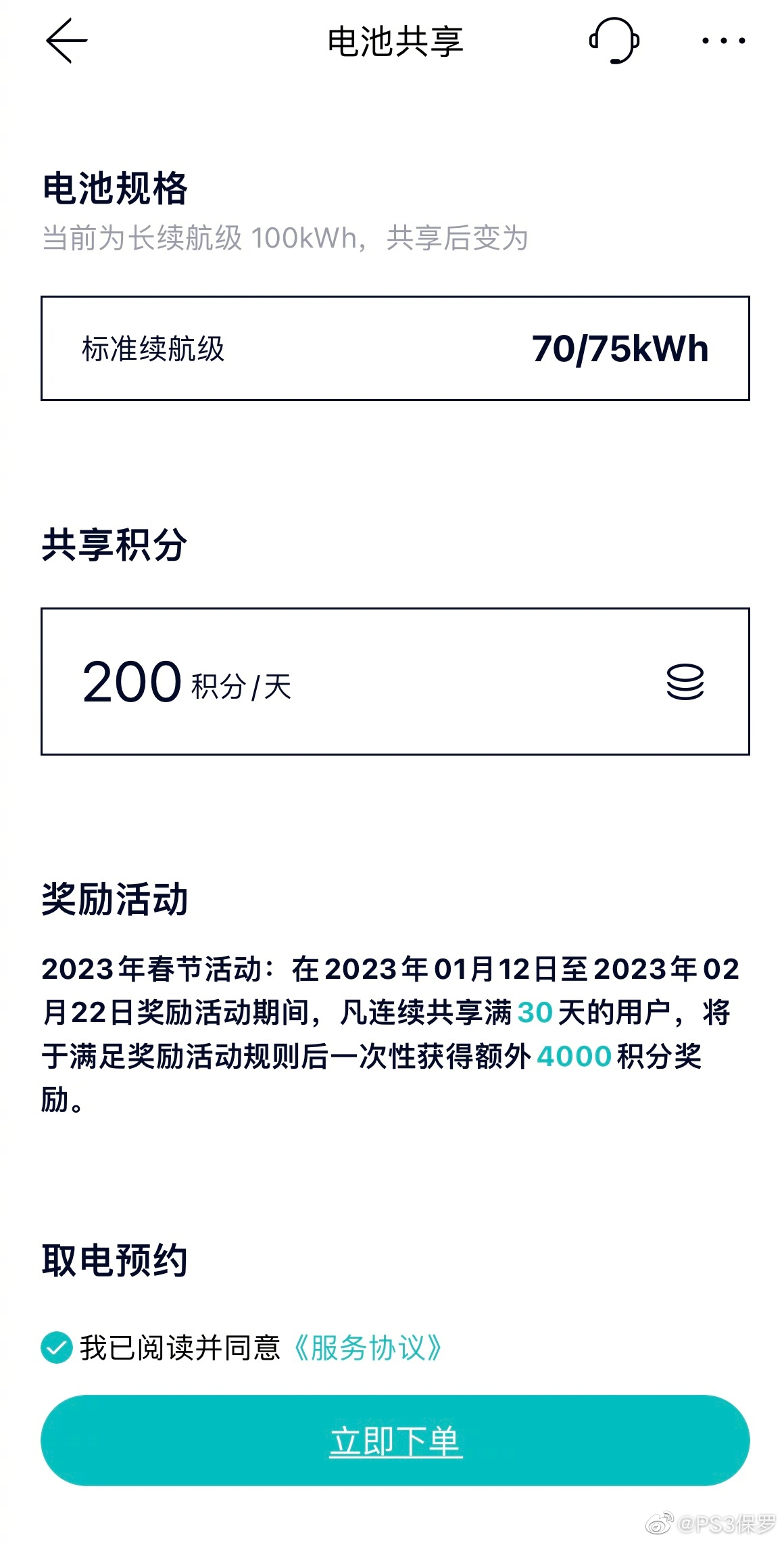 电池还能怎么玩呢,譬如我这台ET7春节不太用,那就可以去换电站把100度的电池换成75度的[doge],每天可以有200积分,春节期间因为大电池的需求量增长,还有额外的奖励积分。这样其实对大家都好,闲着的车挣积分了,大电池供应量也可以缓解[doge]
