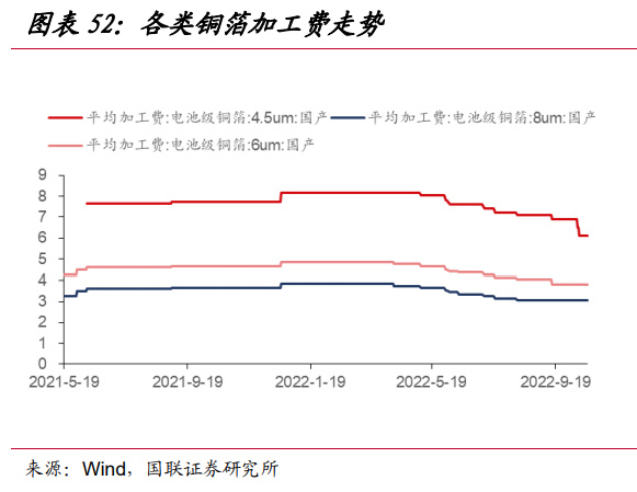 使用 PET 铜箔可大幅降低铜箔原材料成本。传统铜箔由纯铜制备,铜成本占铜 箔总成本约 84%,而 PET 铜箔是在 PET 基膜表面进行镀铜,成本由 PET 价格和铜 价共同决定,益于 PET 材料的低成本,PET 铜箔能为电池带来更更低的材料成本。 截至 2023 年 4 月 10 日,铜价约为 6.9 万元/吨,PET 材料价格约为 2.6 万元/ 吨,经我们测算,6.5μm 的 PET 铜箔较目前主流的 6μm 铜箔可降低 62.42%的原材 料成本,较目前最为先进的 4.5μm 铜箔可降低 51.68%的原材料成本。 使用 PET 铜箔可显著提升电池能量密度。PET 材料密度约为 1.4g/cm³,而铜的 密度为 8.96g/cm³,因此 PET 铜箔的单位面积质量远低于传统铜箔的单位面积质量。 经我们测算,电池容量为 50kWh 前提下,6.5μm 的 PET 铜箔较目前主流的 6μm 铜 箔可提升能量密度 9.64%,较目前最为先进的 4.5μm 铜箔可提升能量密度 5.75%。