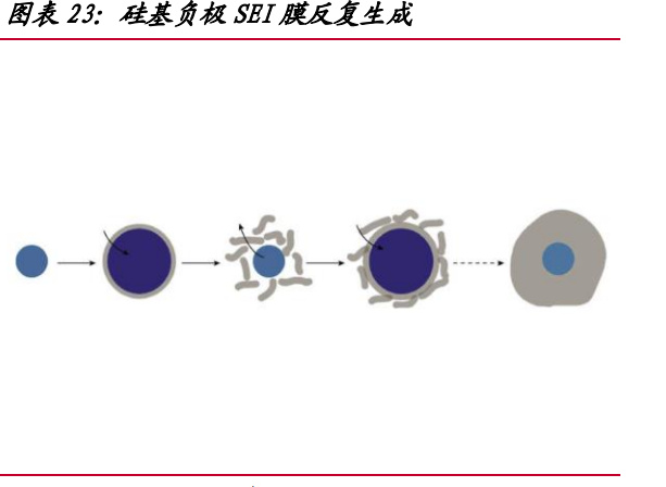 首次效率低。SiO 首次嵌锂时不可逆的形成 Li2O 和 Li4SiO4 等惰性组分,该组 分属不可逆产物,在放电过程中此部分锂不能回到正极材料中,会对正极材料中的活 性锂造成消耗,相较于传统石墨负极,降低首次效率 10%左右。 SEI 膜反复生成。硅单质表面形成 SEI 膜疏松且厚、不均匀分布于活性材料表 面,离子阻抗高,阻碍锂离子扩散。嵌脱锂过程会使 Si 表面的 SEI 反复地破裂和生 长,既不断地消耗电解液,也会大量地消耗活性锂,造成电池循环性能下降。