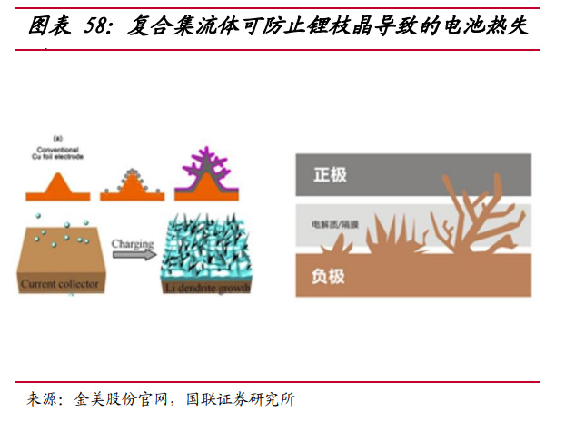 断路效应保证电池安全性。锂离子电离迁移时的数量若超过负极可嵌入数量,会 在负极表面产生锂枝晶,枝晶会穿透隔膜,继而造成内短路并引起热失控。PET 铜箔 受到穿刺时产生的毛刺尺寸较小,且铜箔中间的高分子材料层会发生断路效应从而控制短路电流不增大,从根源上杜绝电池爆炸起火的可能性。