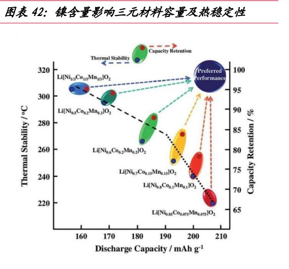 高镍低钴挑战与机遇并存。三元材料中三元素具有协同作用,其中 Ni2+起到提高 容量的作用;Co3+可以降低锂镍混排,提升材料电子电导率,提升倍率性能;Mn4+可 以降低材料成本,提升结构稳定性和安全性。提高镍占比使得三元材料在相同电压区 间内材料的实际容量上升,但是,随着镍含量的上升,材料表面活性增大给实际应用 带来一些挑战,具体表现为: (1)随着镍含量上升,三元正极材料热稳定性下降。 (2)循环寿命下降。相同电解液,高镍三元循环寿命可能更短。 (3)高镍材料在制备与存储过程中,更容易与空气中的水和 CO2 反应,影 响材料的加工性能和电池的电化学性能。