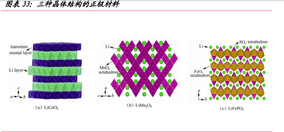 三元材料克容量优势明显。正极材料根据晶体结构可以分为三大类,层状结构以 钴酸锂、三元材料为代表,尖晶石型以锰酸锂为代表,磷酸铁锂、磷酸锰铁锂则属于 橄榄石结构。层状材料拥有最高的理论克容量及平均电压,一般应用于长续航里程车 型中;磷酸铁锂能力密度低于层状材料,但因晶体结构稳定,因此安全性能较好,且 因不含镍、钴等价格较高的元素,材料价格低于层状材料,因其具有较高的性价比占 是目前装机占比最大的体系;锰酸锂材料理论能量密度最低,仅有极少量应用于低端 市场。