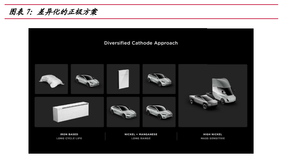 三条路径实现正极升级。NCM 三元材料中,Ni 元素具有较高的能量密度,Co 元 素提升电导率并稳定结构,本身不贡献能量且成本较高,所以 NCM 材料的高镍低钴 (甚至无钴)是其发展的主要方向。为降低 Co 元素的成本影响,特斯拉在其不同产 品矩阵中应用不同的正极材料,探索三种放弃钴材料的思路: 1)对于入门级产品和储能电站,使用磷酸铁锂体系,平衡性价比及服 役寿命; 2)中长续航乘用车领域,特斯拉采用自研无钴高镍二元正极,倾向于 2/3 镍 及 1/3 的锰,该材料目前仍属概念阶段,但具有一定想象力; 3)在其长续航里程车型及 Cybertruck 皮卡和 Semi 卡车中明确使用高镍材 料,主打高能量密度,提升车辆续航里程。