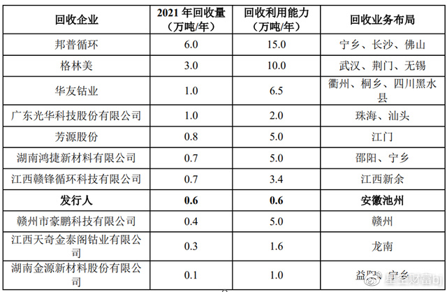 《招股说明书》中披露了11家电池回收企业。这些企业2021年的回收利用能力为55.1万吨,而实际回收量仅为14.6万吨。由此可见,市场的回收能力是相对过剩的。小作坊和正规军共存的锂电池回收市场,竞争越来越激烈。在这种情况下,谁能有稳定和价格合理的货源就尤为重要。