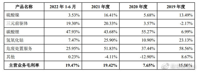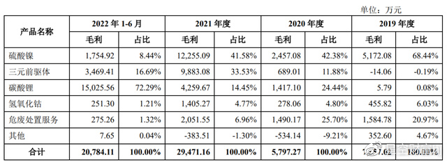 最近3年半,西恩科技的收入构成发生了较大的变化。主要是硫酸镍的收入占比从2019年的80.19%下降到2022年上半年的46.6%。三元前驱体收入占比较为波动,2019年至2022年上半年分别为1.35%、25.44%、32.03%和16.84%。碳酸锂的收入占比在2019年为0.17%,2021年增至6.43%,2022年上半年一跃增至29.36%。