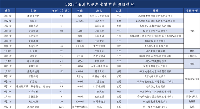 据广东省电池行业协会不完全统计,2025年5月,中国电池产业链企业公布的扩产(包括拟建、扩建、开工)项目达19个;其中有15个项目公布投资金额,公布投资总额超377.38亿元;5月扩产项目中百亿级项目有1个。