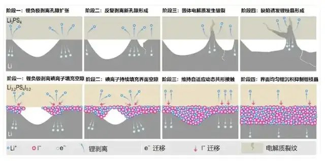 中国科学院物理研究所的黄学杰团队提出的方案是在电解质中引入碘离子。电池工作时,这些碘离子在电场作用下移动到电极界面,形成一层富碘界面,该界面会主动吸引锂离子,自动填充所有缝隙和孔洞,使电极与电解质紧密贴合。