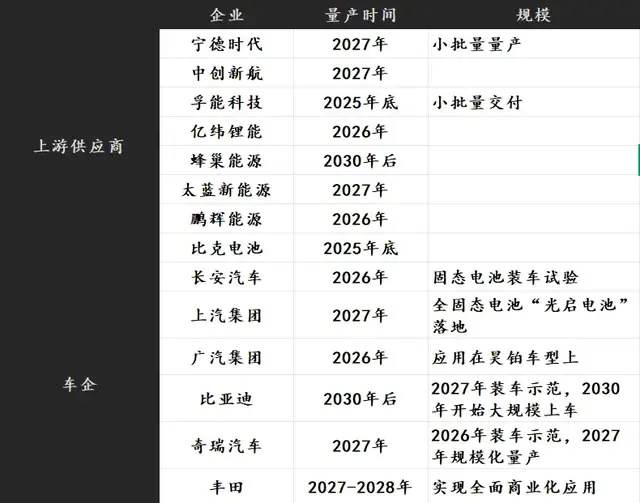 换言之,这两套方案目前仍处于实验室阶段,尚未有成熟的量产计划。即便进入量产阶段,从量产下线到装车试验,仍需漫长的探索。所以,许多主机厂宣称2026年就能量产上车的固态电池,估计还是会跳票。