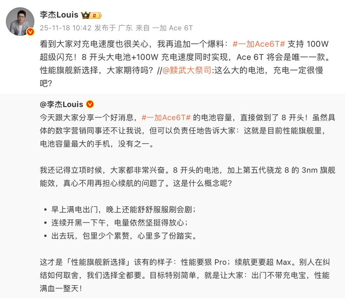 另外一加 Ace 6T配备超8000mAh大电池,支持100W快充,用的久还充的快,这个配置在目前的性能旗舰里非常少见。一加 Ace 6T应该还有更多猛料,值得蹲一波新机发布。#一加Ace6T电池冲上8000mAh#