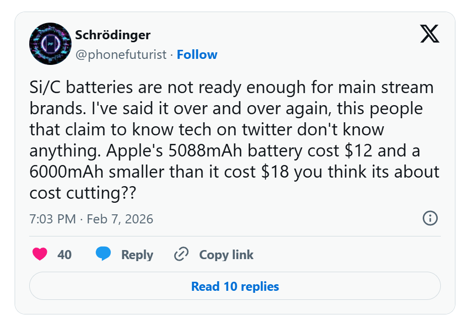 2月7日,外网的一位科技博主Schrödinger在社交平台X上讨论硅碳电池的优劣时提到,搭载于iPhone 17 Pro Max的5088mAh的电池,苹果的采购成本仅为12美元(当前汇率下约人民币83元)。作为对比,能量密度更高且体积更小的6000mAh硅碳电池成本约为18美元。